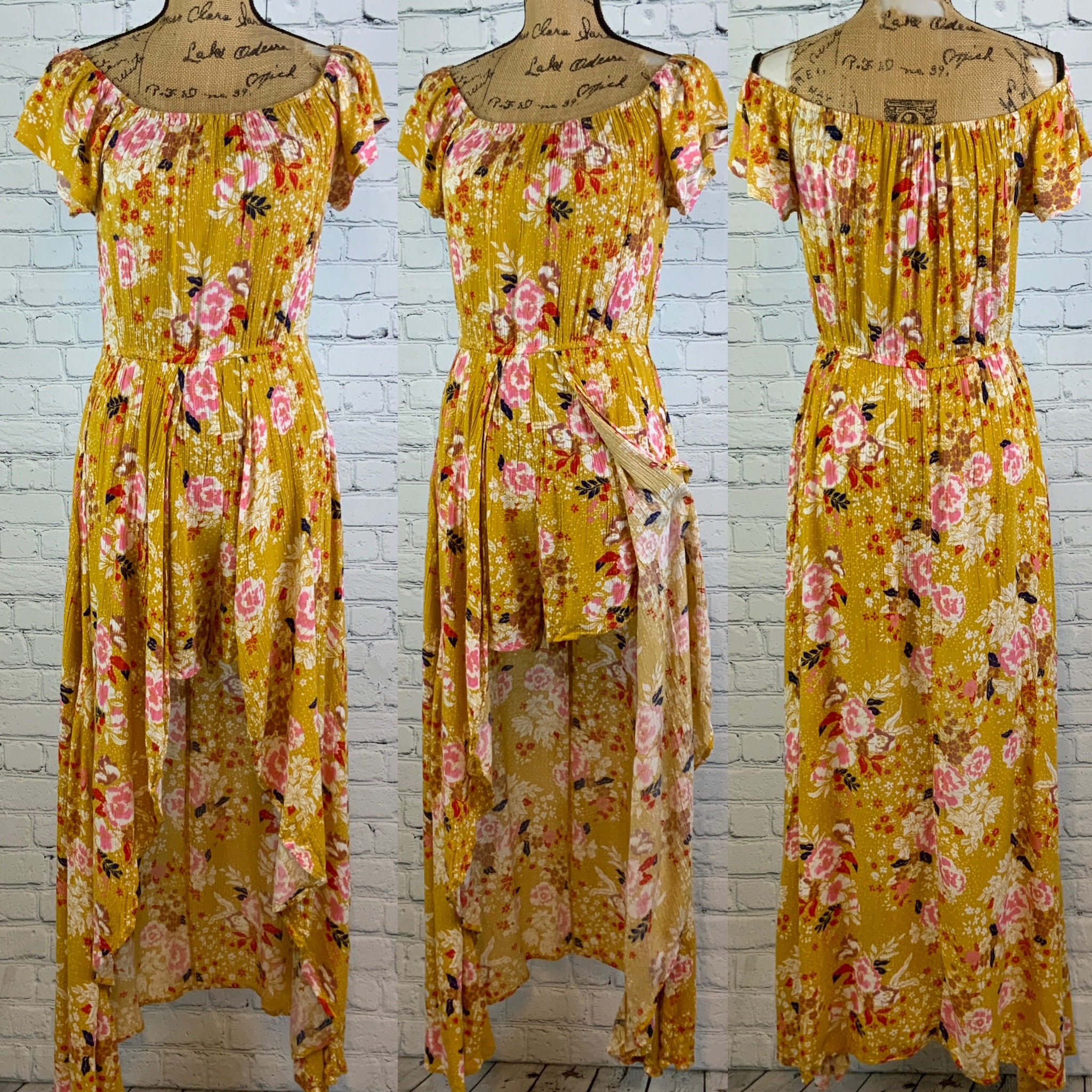 / Altar’d State Crinkly Yellow Floral Off Shoulder High Lo Maxi Romper