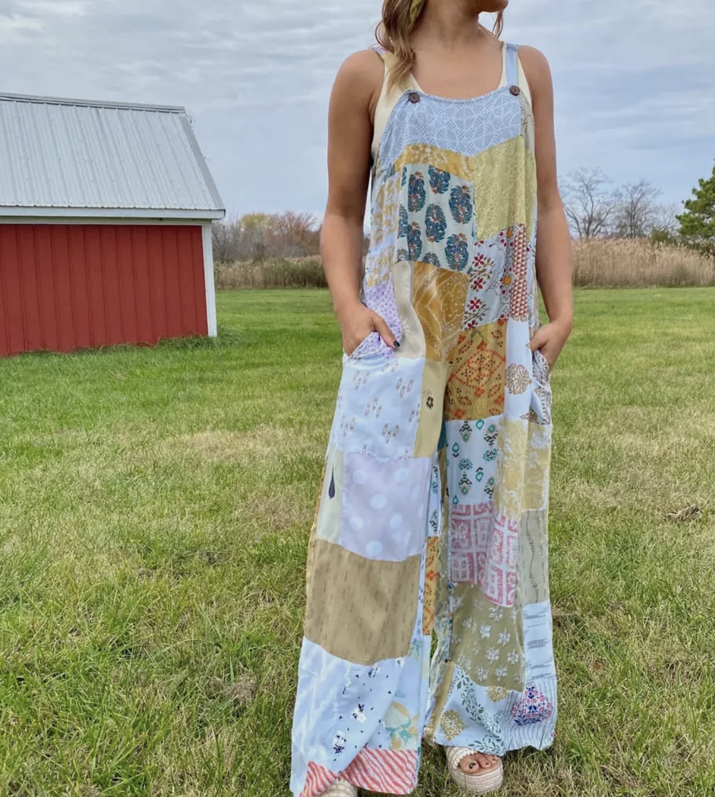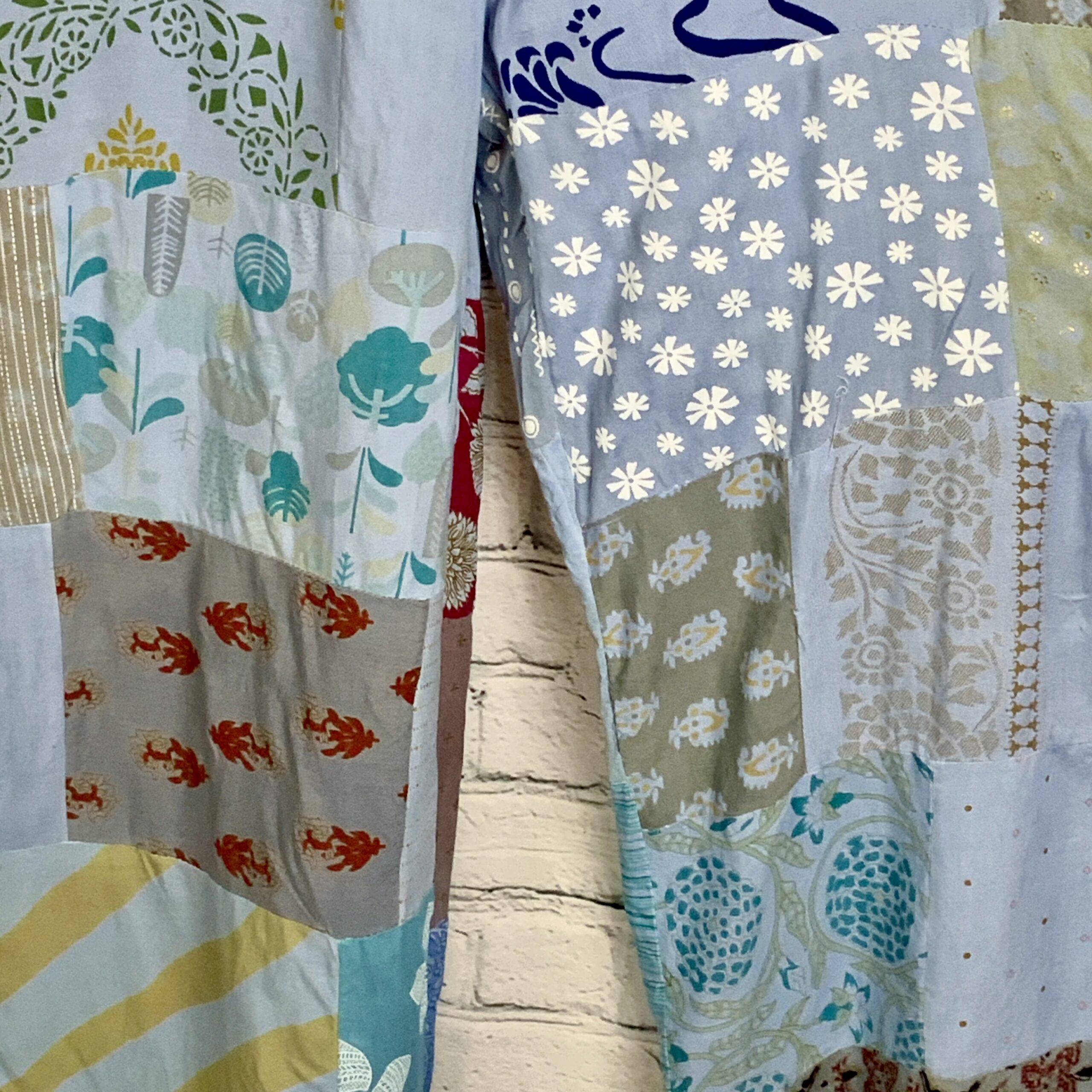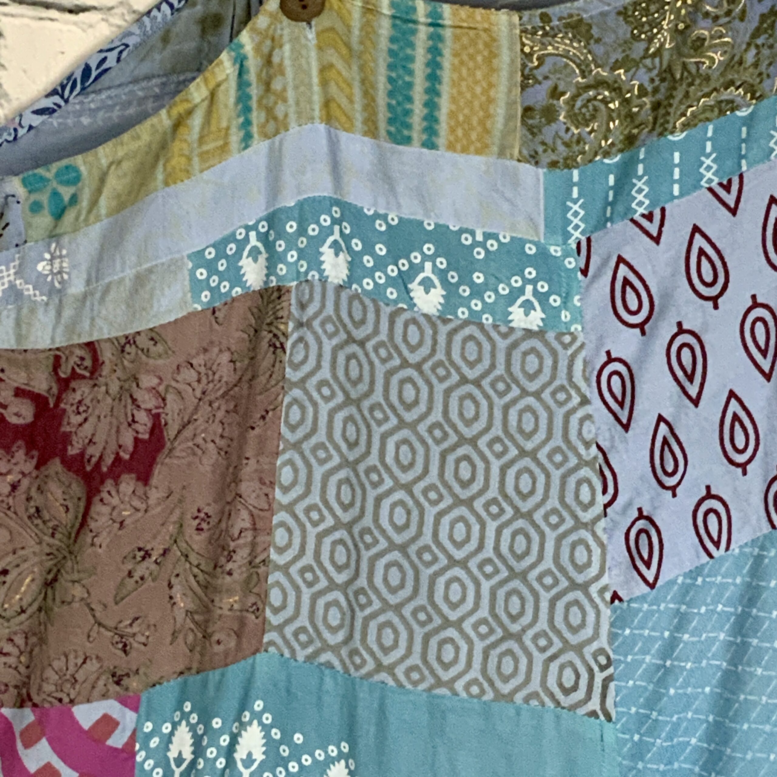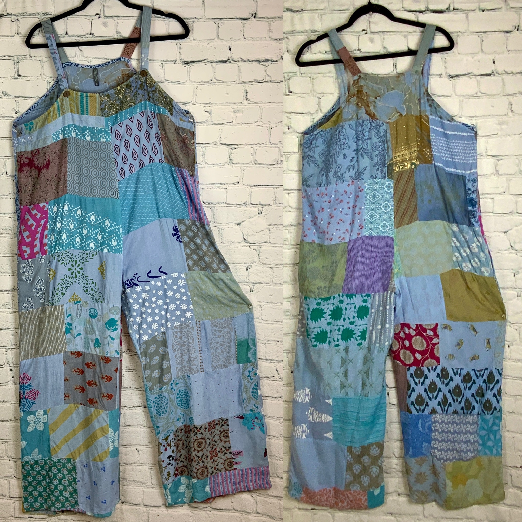 New – Blue patchwork overalls have 3 button adjustable straps, side pockets & very wide legs. Fair trade.
