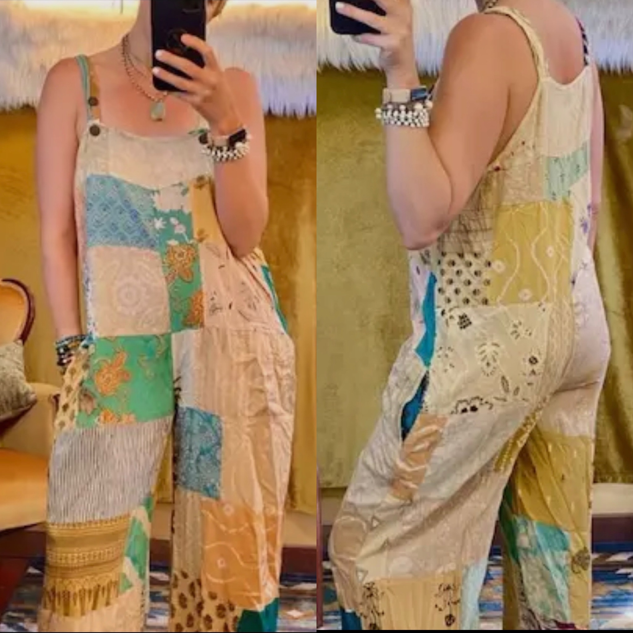 New – Sand patchwork overalls have 3 button adjustable straps, side pockets & very wide legs. Fair trade.