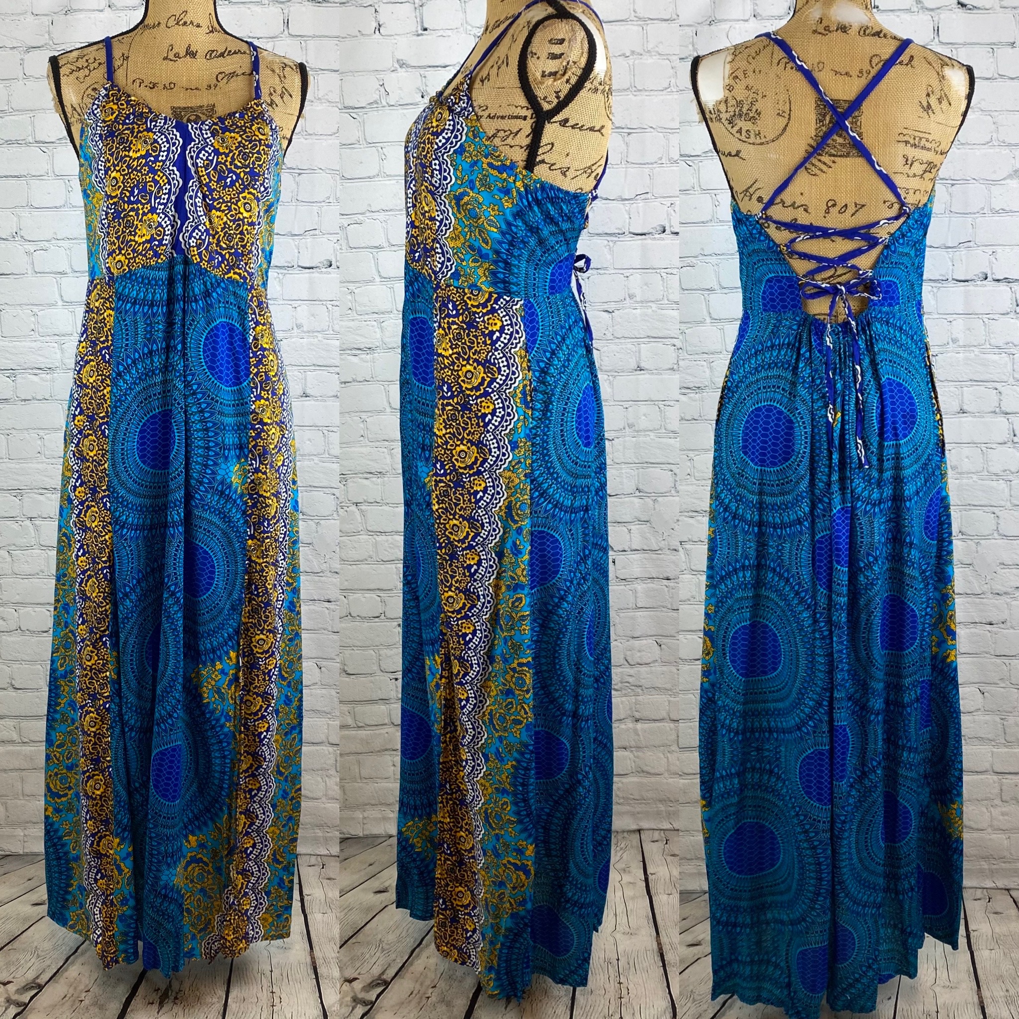 New – Boho mandala print maxi has adjustable straps that lace down the back, elastic edges, side front leg slit and deep side pockets.