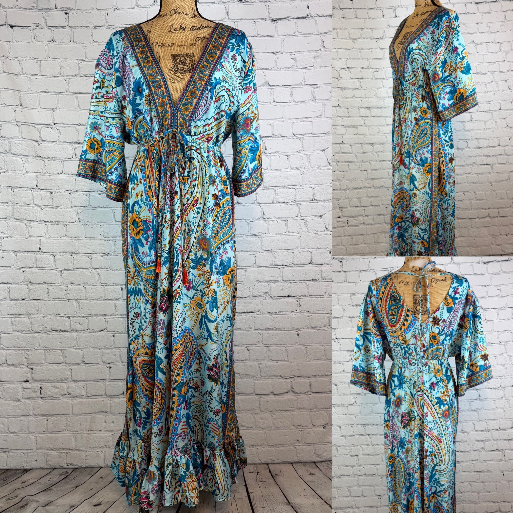 Boho paisley print maxi has a v neckline with security straps that tie across back, kimono sleeves, elastic drawstring waist with tassel ties and ruffled hem.