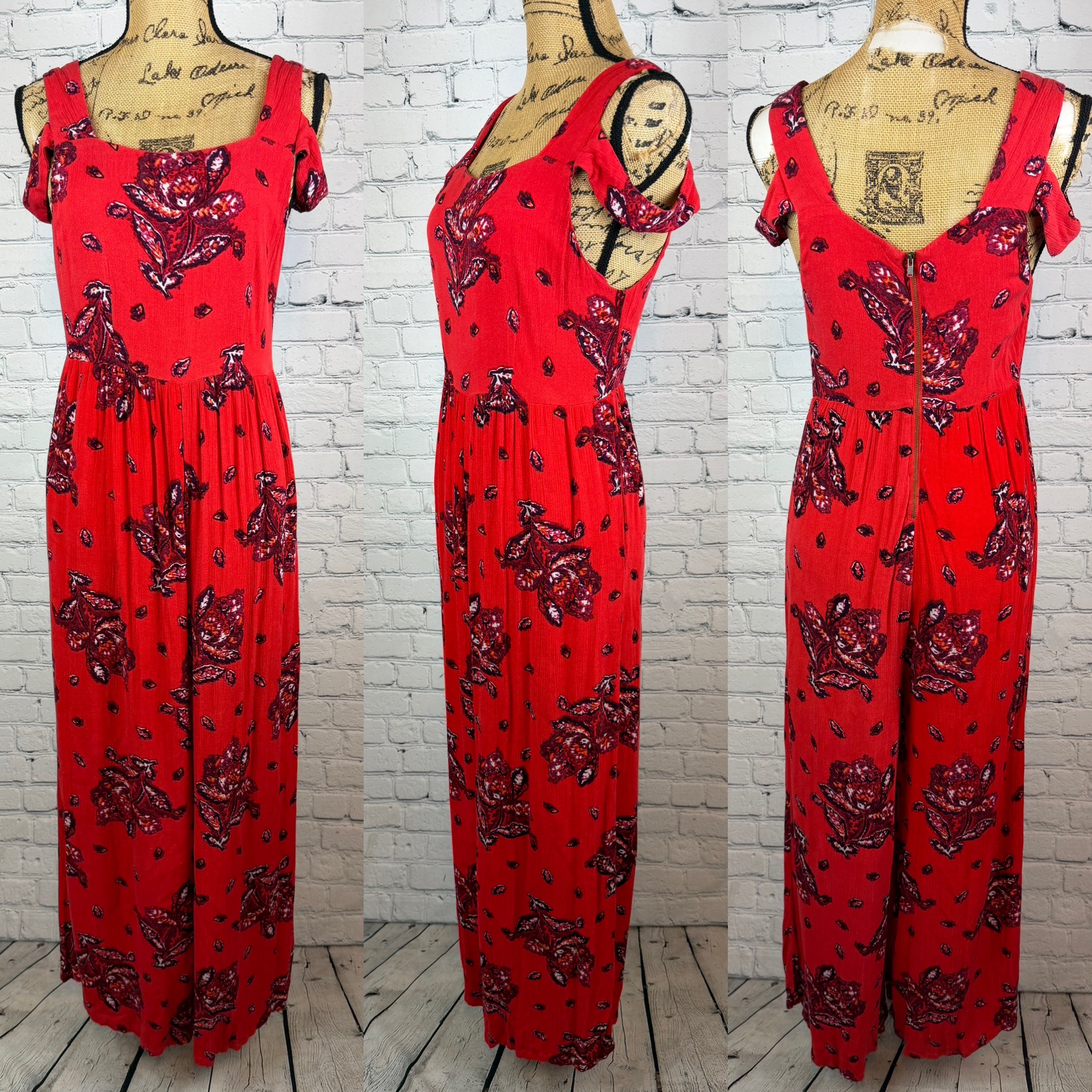 Free People crinkly red floral print Garden Party collection jumpsuit, cold shoulder, wide legs, side pockets, back zipper