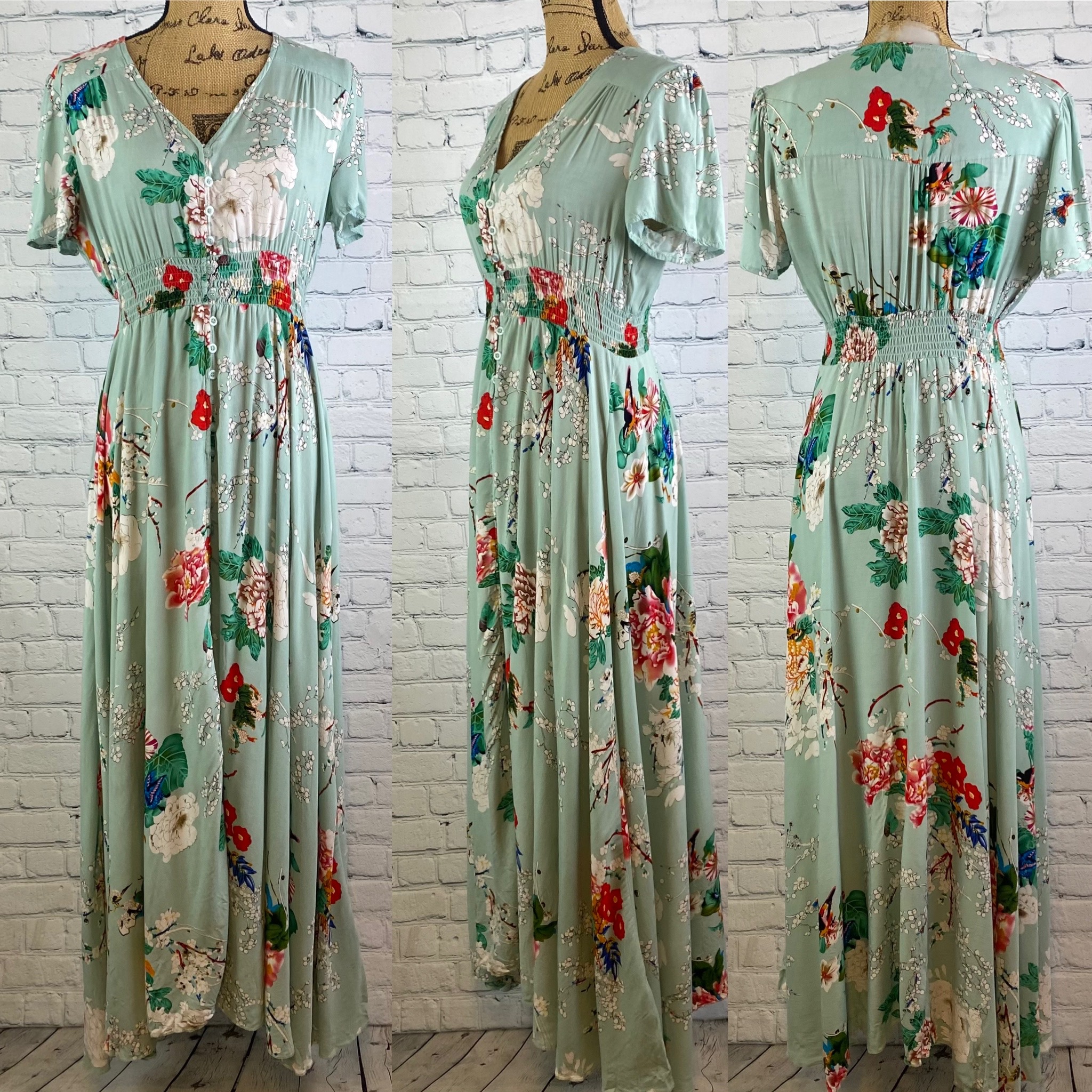 Gorgeous green floral maxi has button down front, short sleeves, elastic waist and flowy bottom.