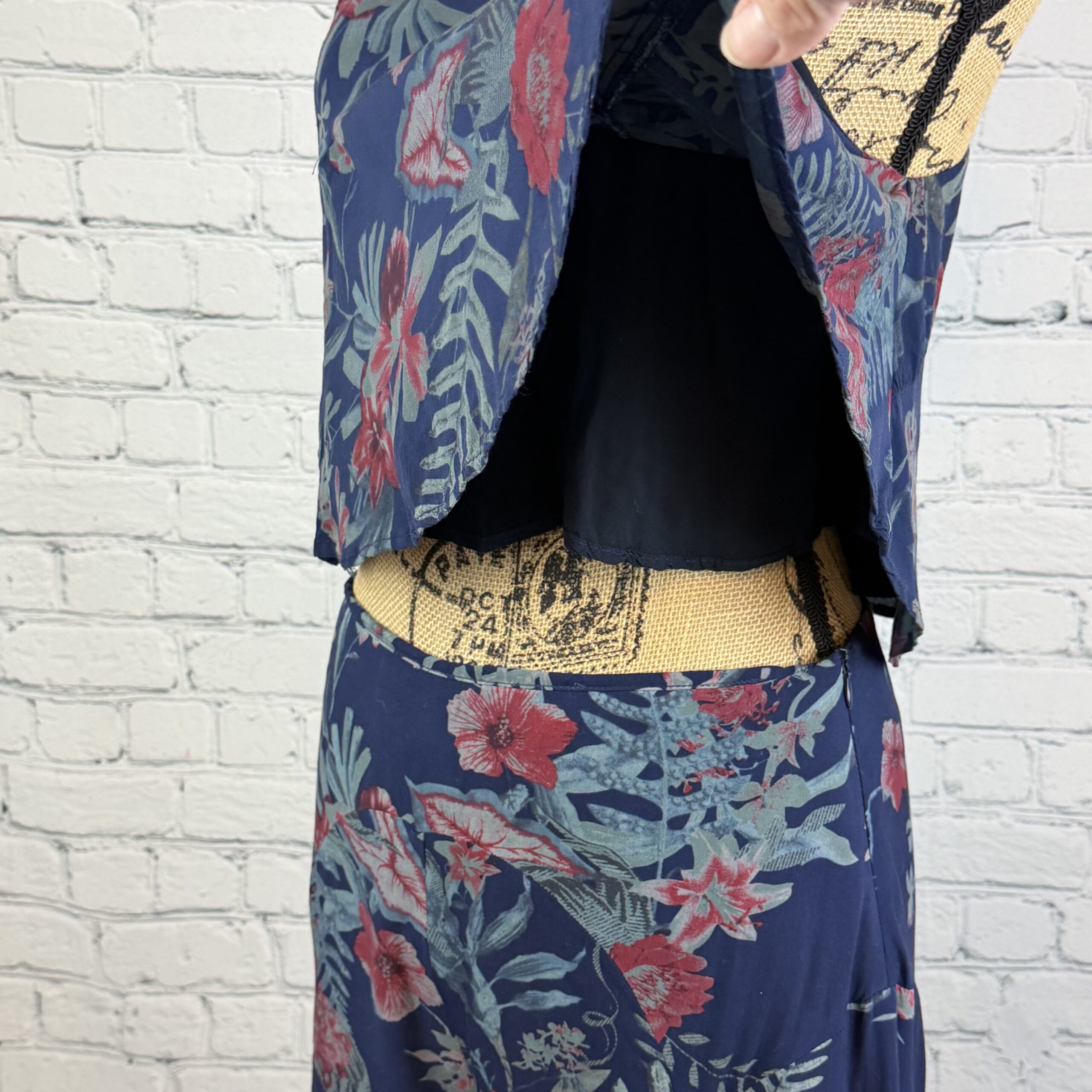 Hommage blue floral pant set has a cami crop top with adjustable straps that cross and tie in back with tassel ties, flowy top with straight lining underneath. Pants have a side zipper and wide legs with saddle seams and gathering on the sides about thigh area. Very flowy.