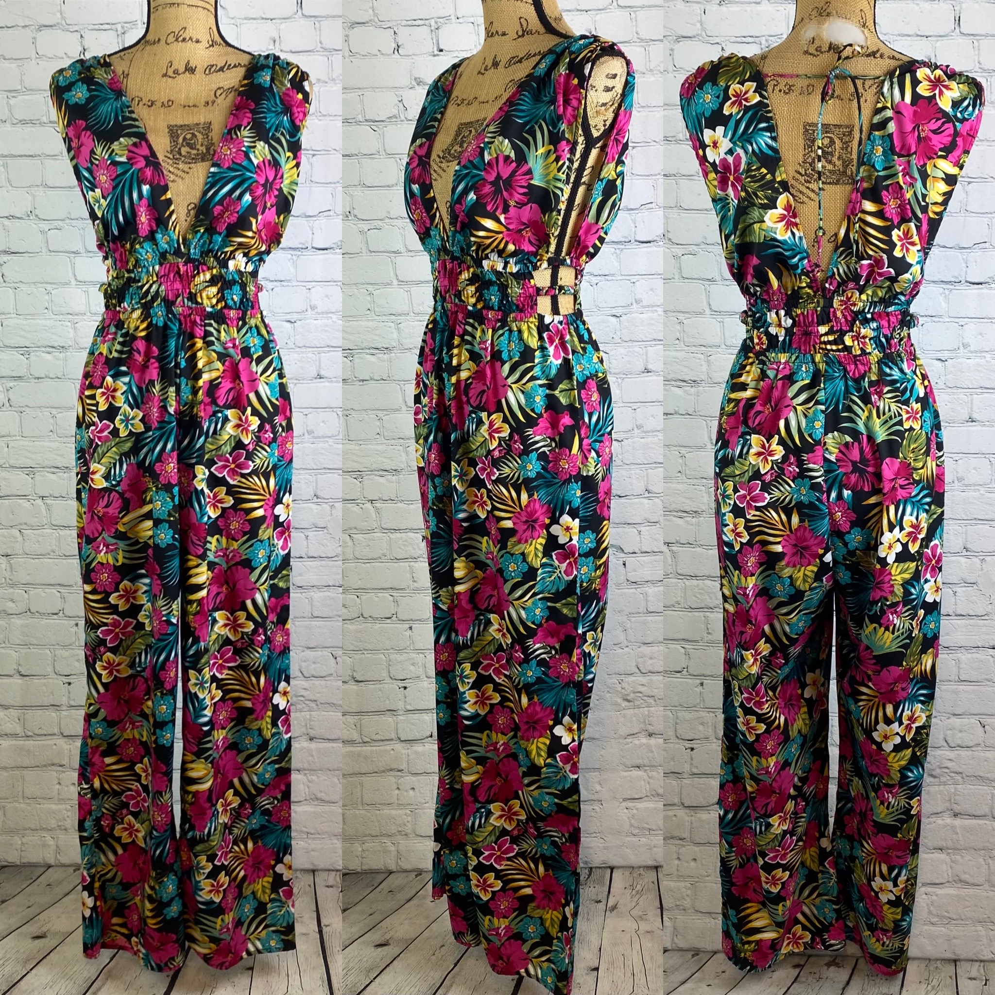 Indulge floral print jumpsuit has a plunge neckline front & back with ties across shoulders, elastic waist & side cutouts with elastic straps and wide legs.