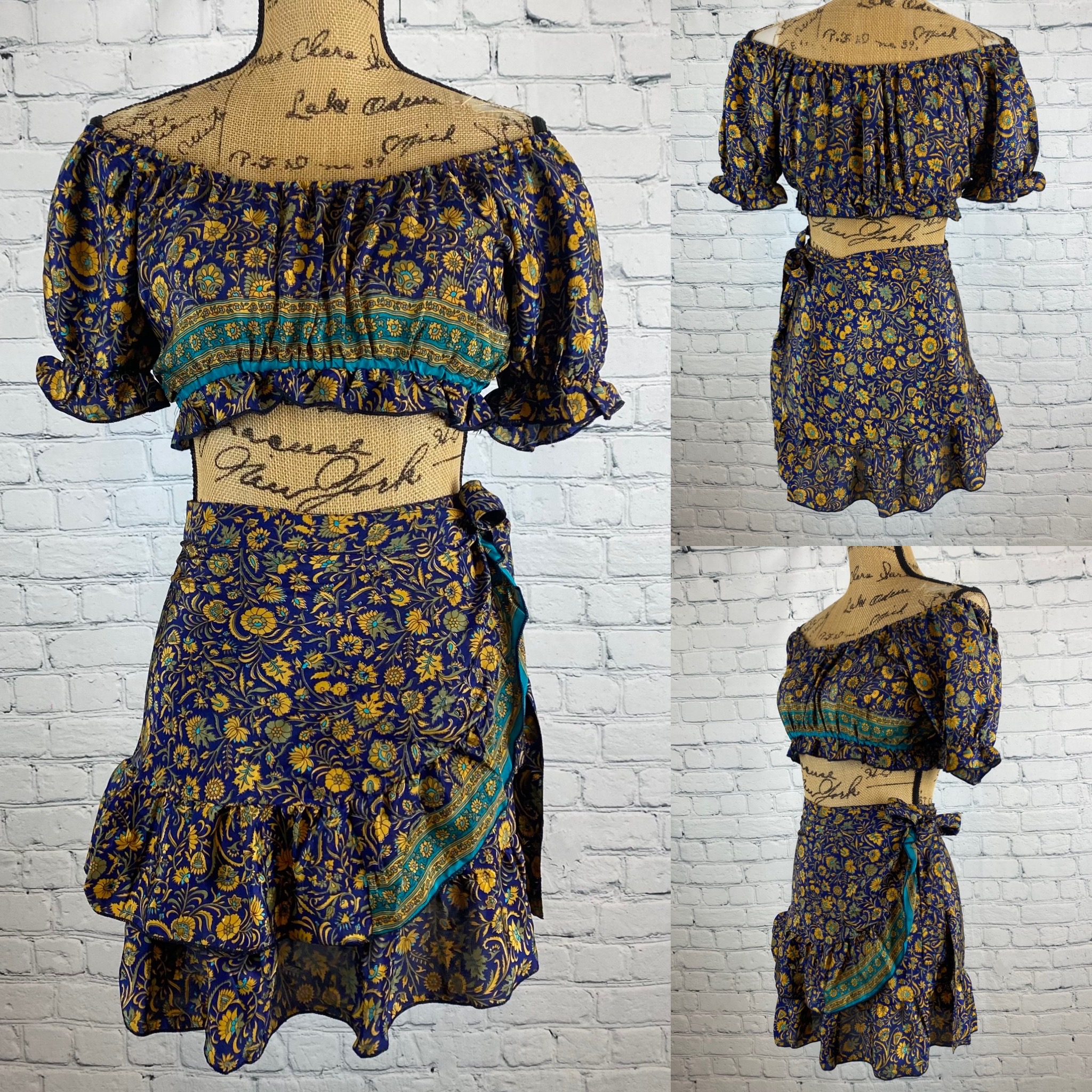 New – Embrace a bohemian vibe with this floral skirt set. The vibrant blue and yellow pattern adds a touch of elegance to your wardrobe. Perfect for casual outings or a day at the beach. Crop top has elastic neckline and bottom edge, short puffy sleeves & ruffled wrap around skirt.