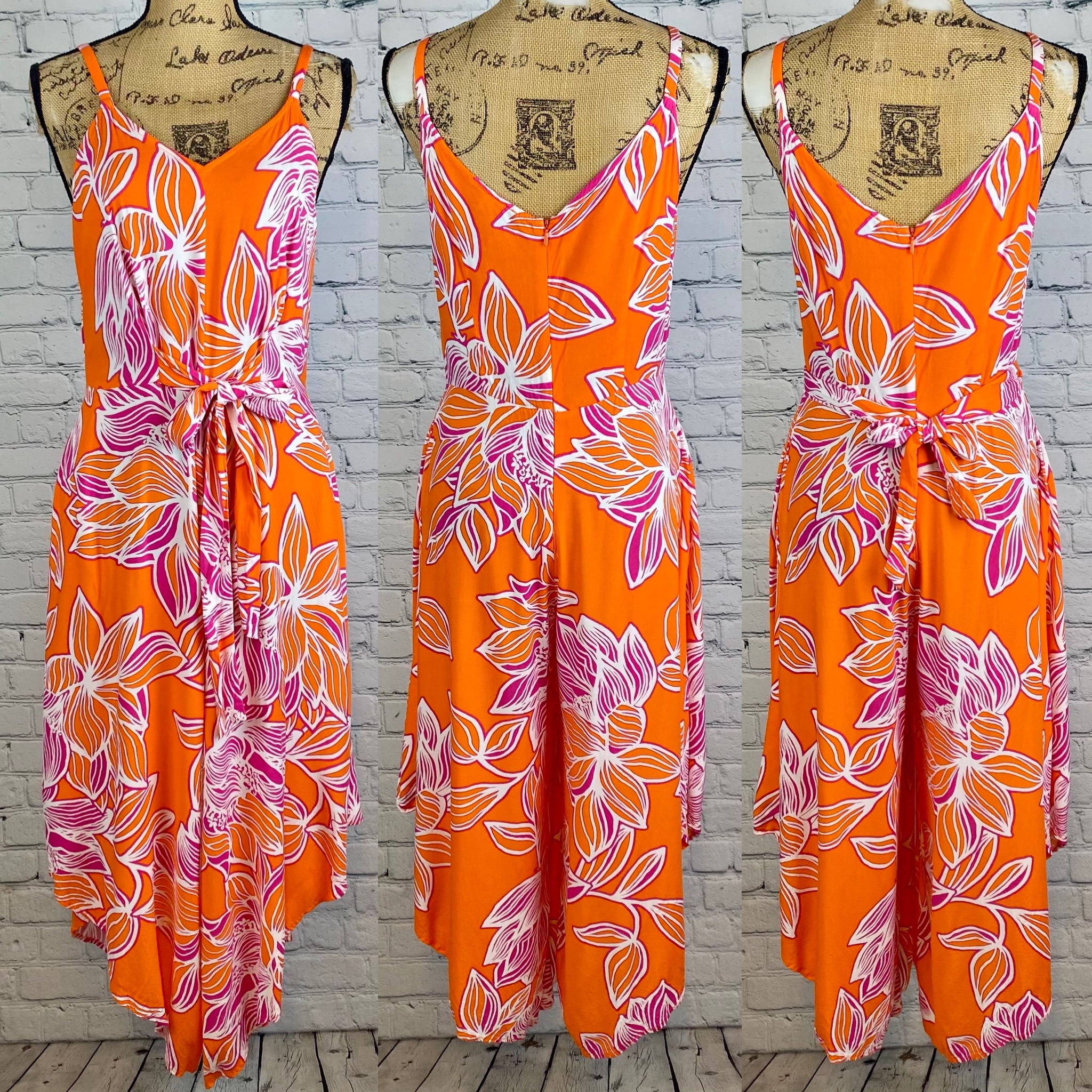 Ivy Street vibrant orange floral print jumpsuit has a v neckline with back zipper, front ties that can be tied in front or back, wide asymetrical legs and side pockets.