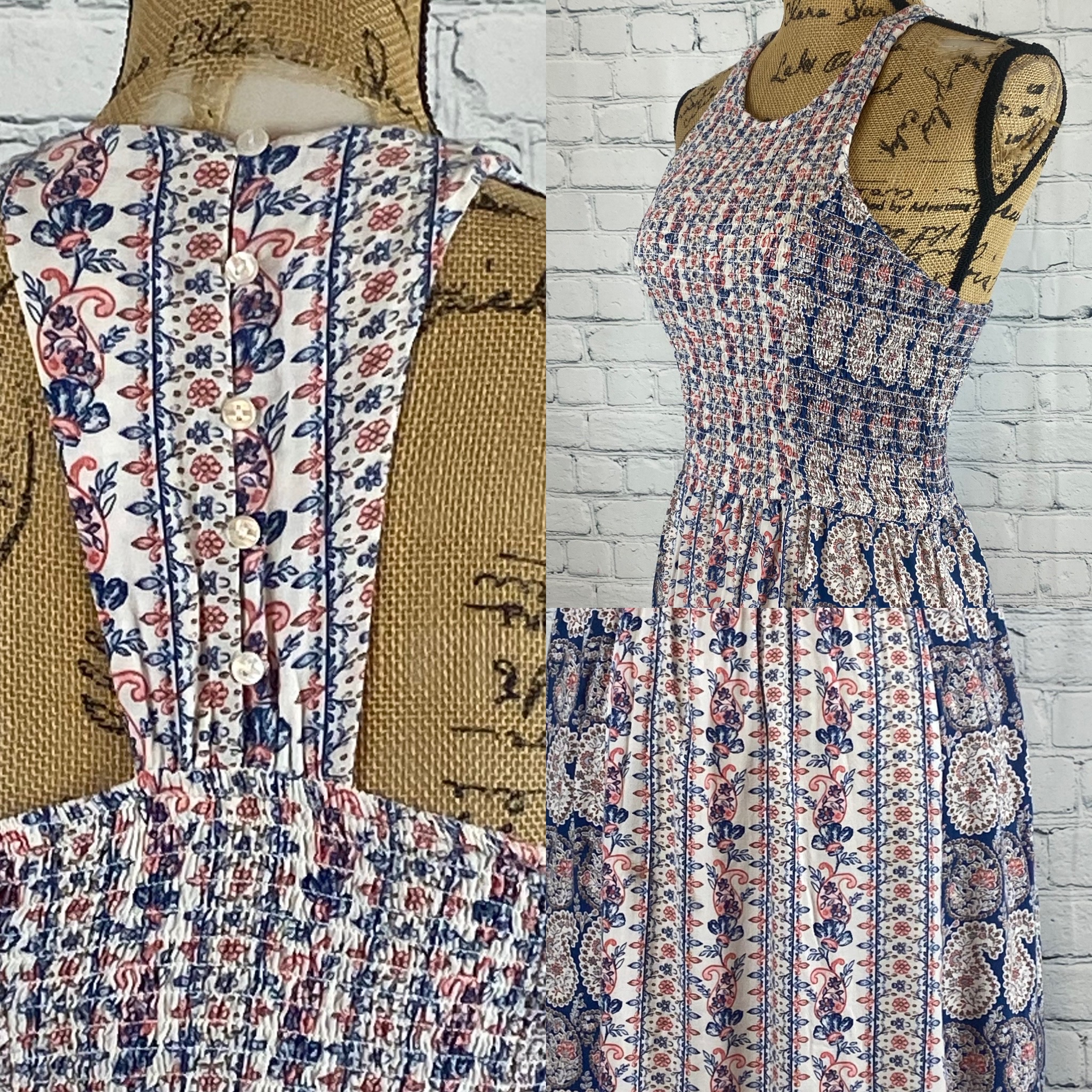 Japna boho paisley print dress has a smock elastic bodice with princess seams, contrasting print and a racerback with button details.