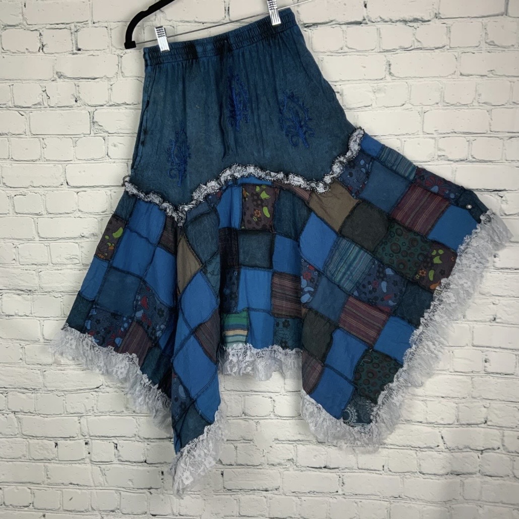 NEW! Blue patchwork asymetrical maxi skirt has drawstring elastic waist and lace trim with side pockets. Fair Trade