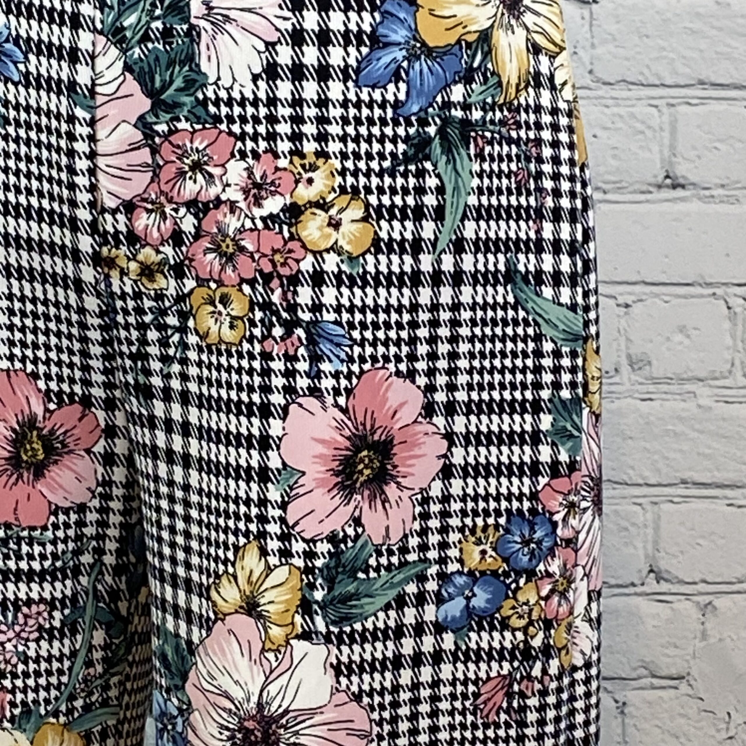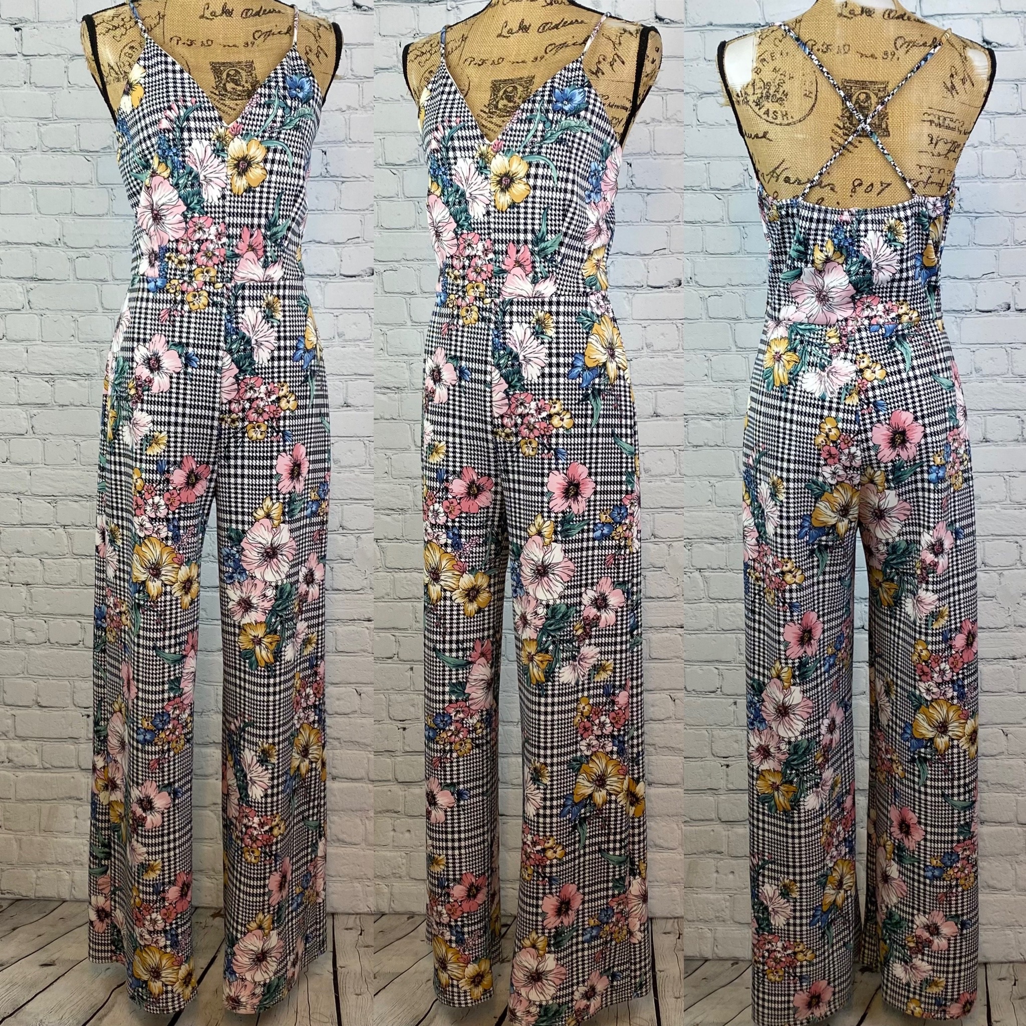 Love Culture floral/check print jumpsuit has v neckline with stretchy straps that cross in back, long wide legs. Lined.