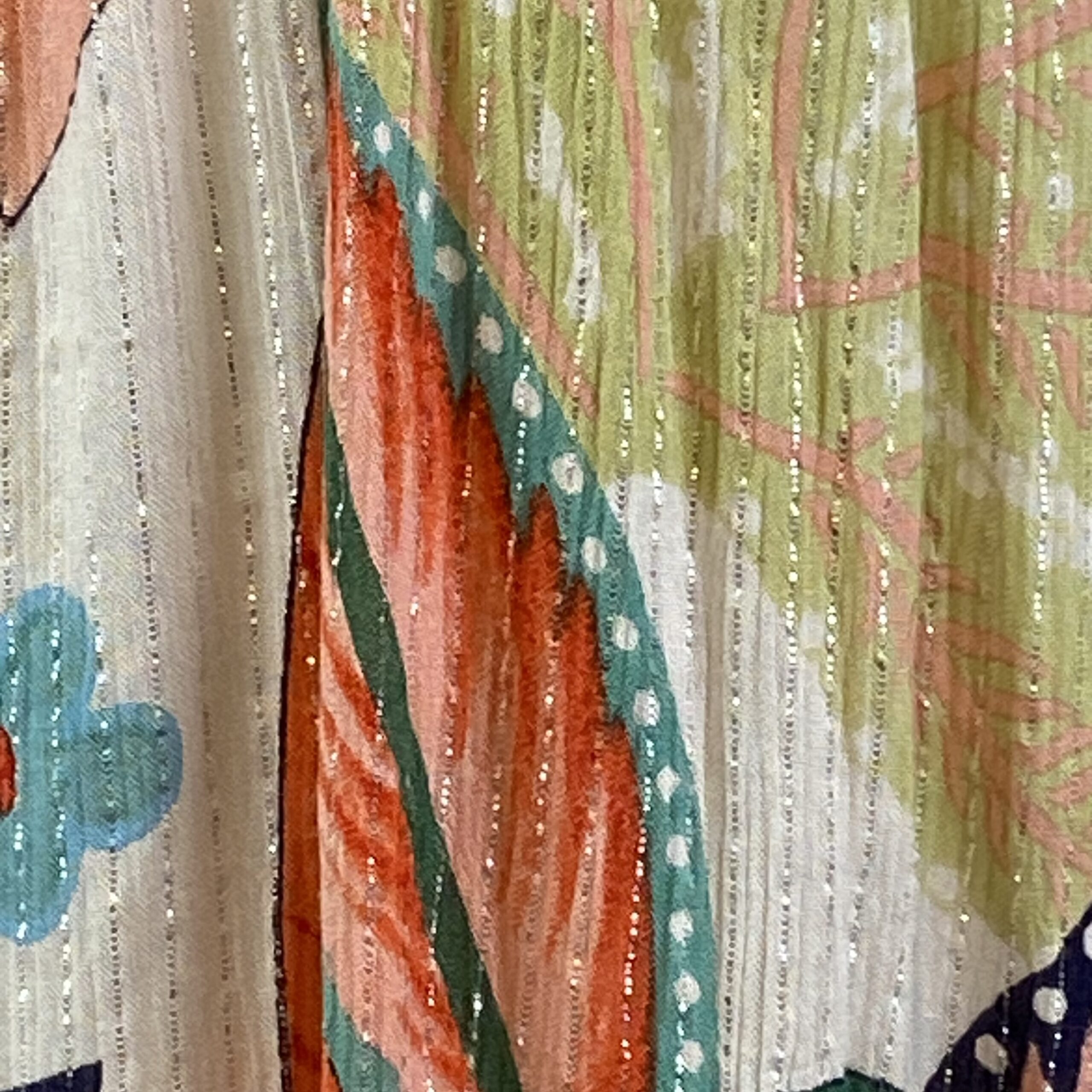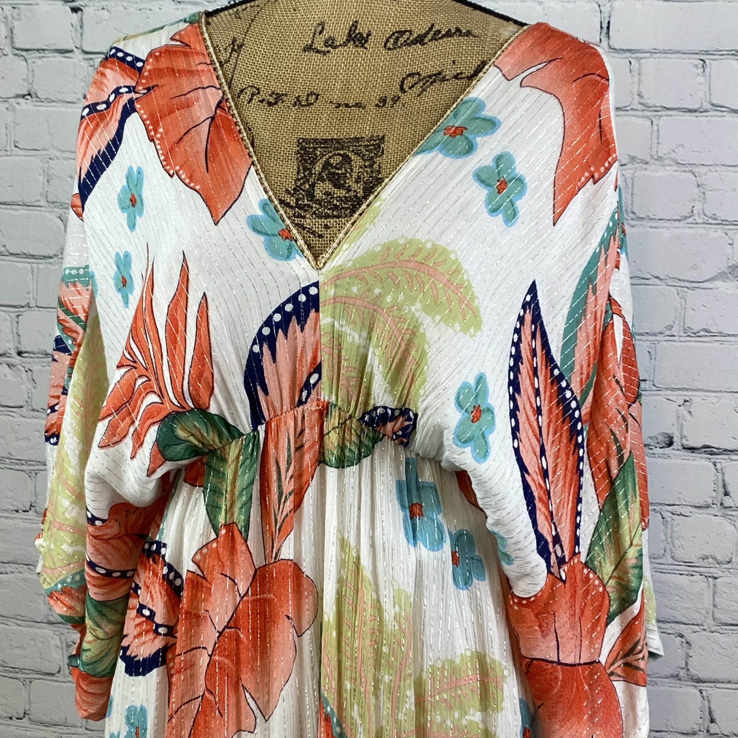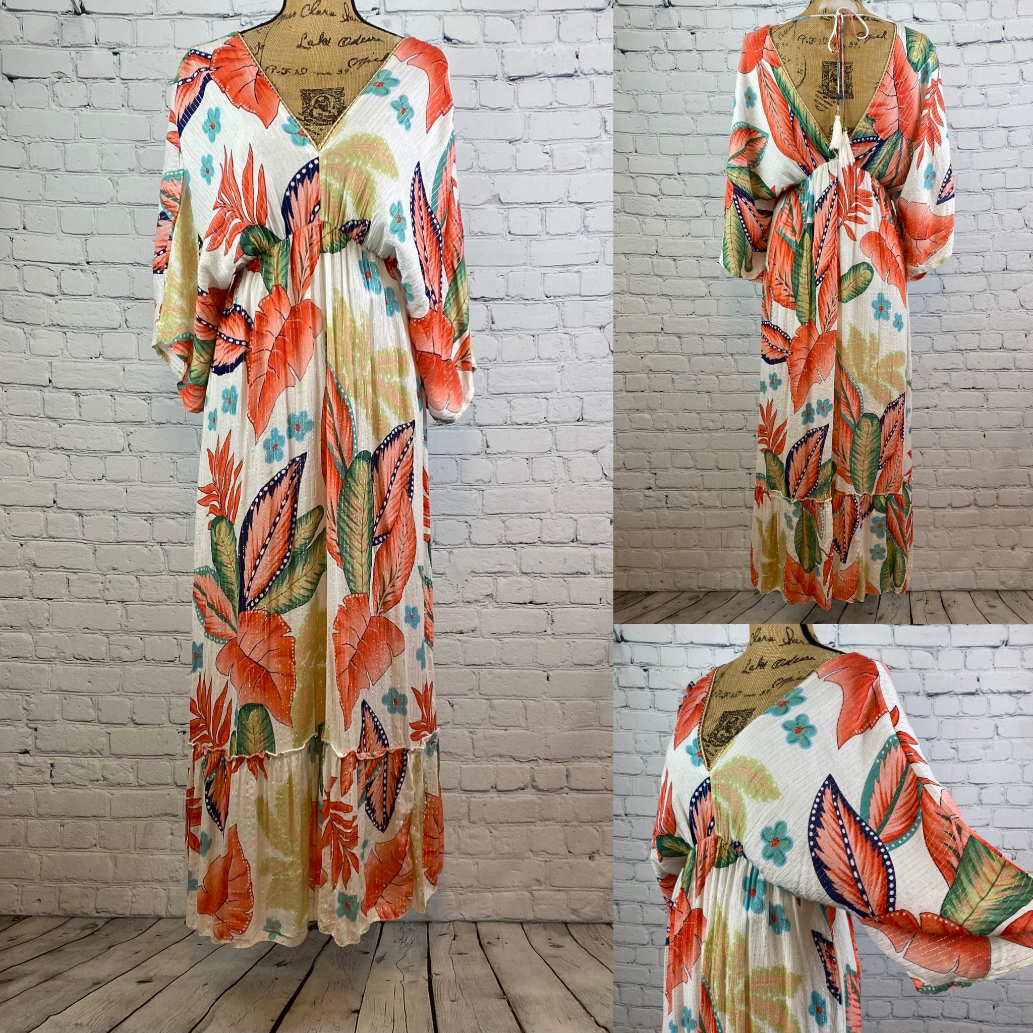 Omanga floral print maxi has v neckline with tassel ties shoulder straps in back, kimono sleeve and elastic waist, silver threading throughout and ruffled hem. Lined