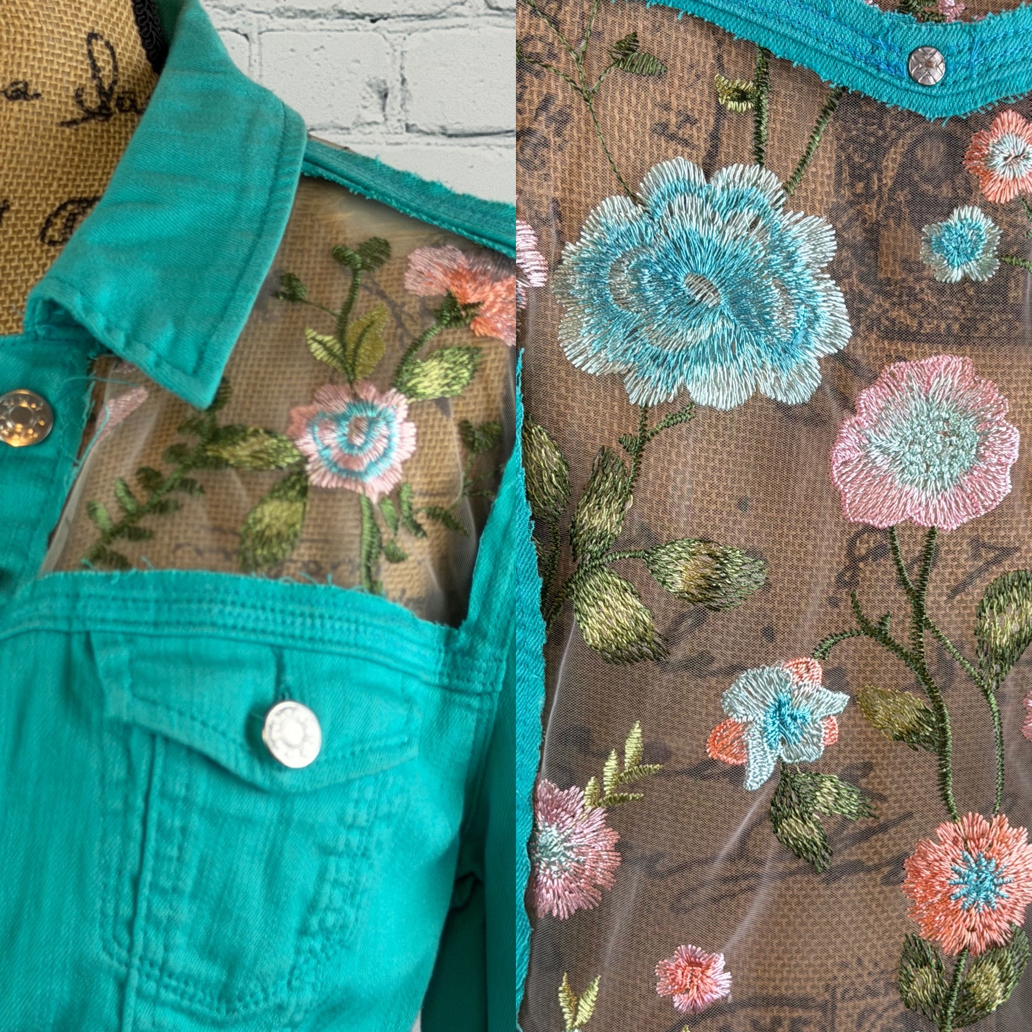 One of a Kind Upcycled Aqua Jean Jacket with Embroidered Tulle Lace quantity