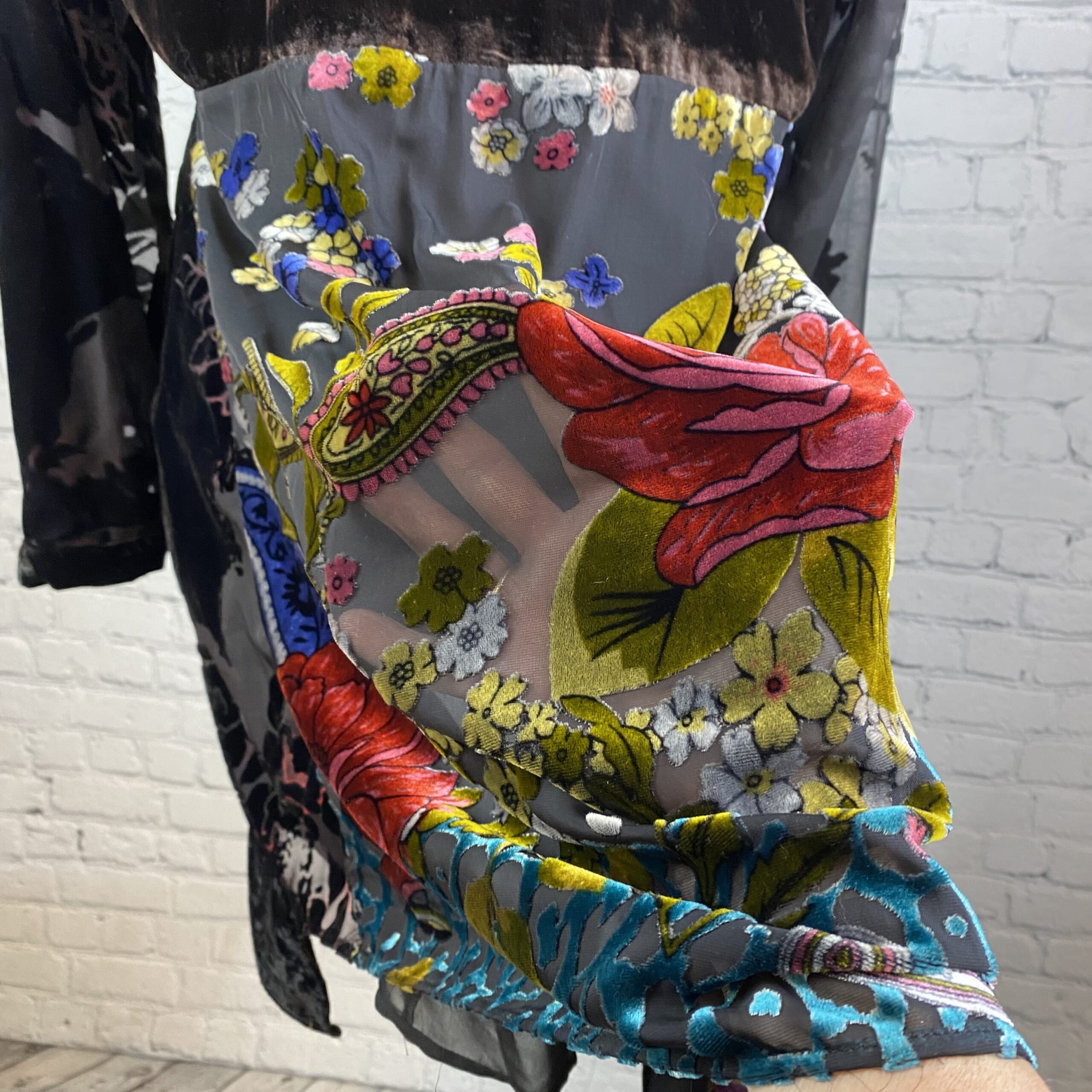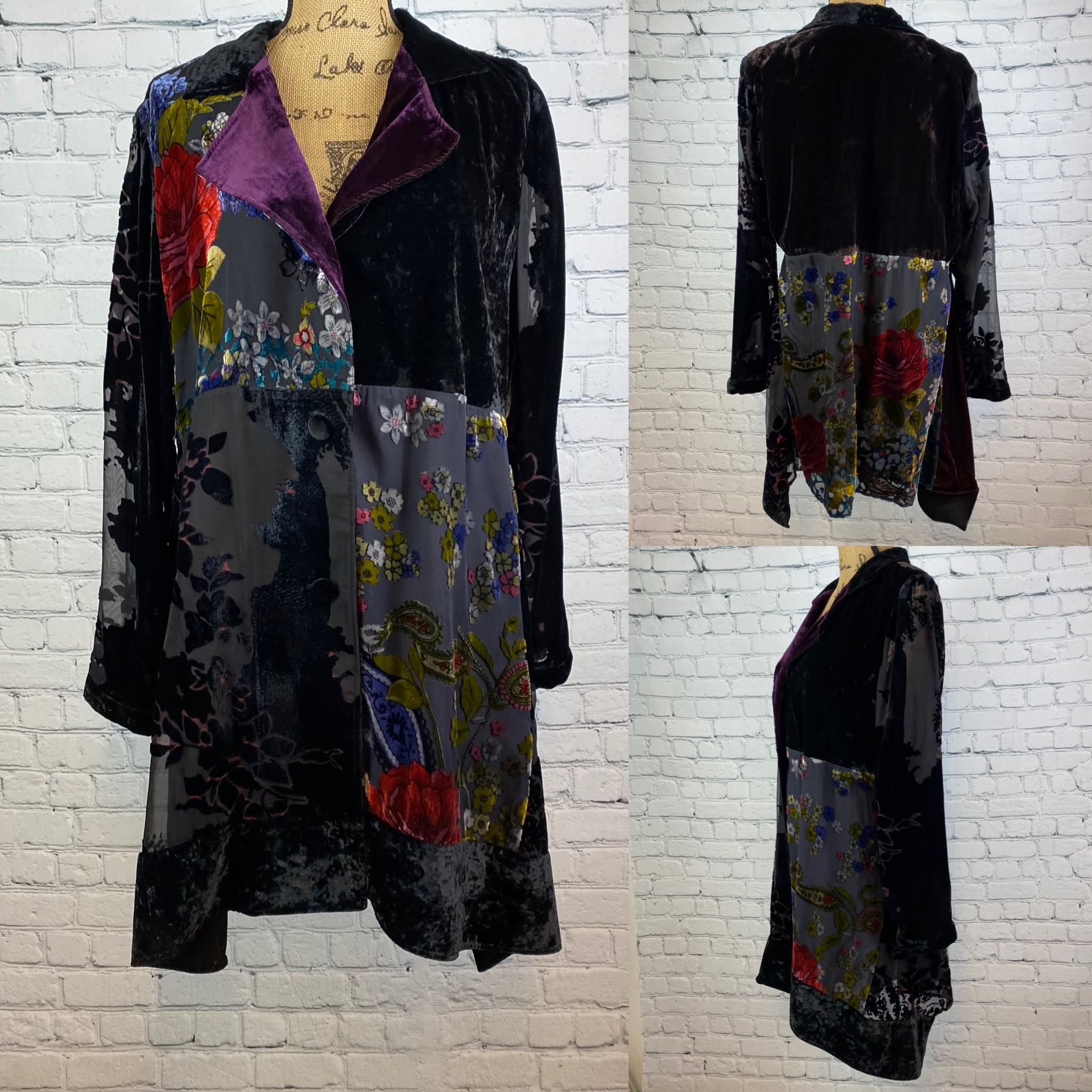 Soft Surroundings unique velvet burnout jacket with patchwork appeal, 3 button down front.