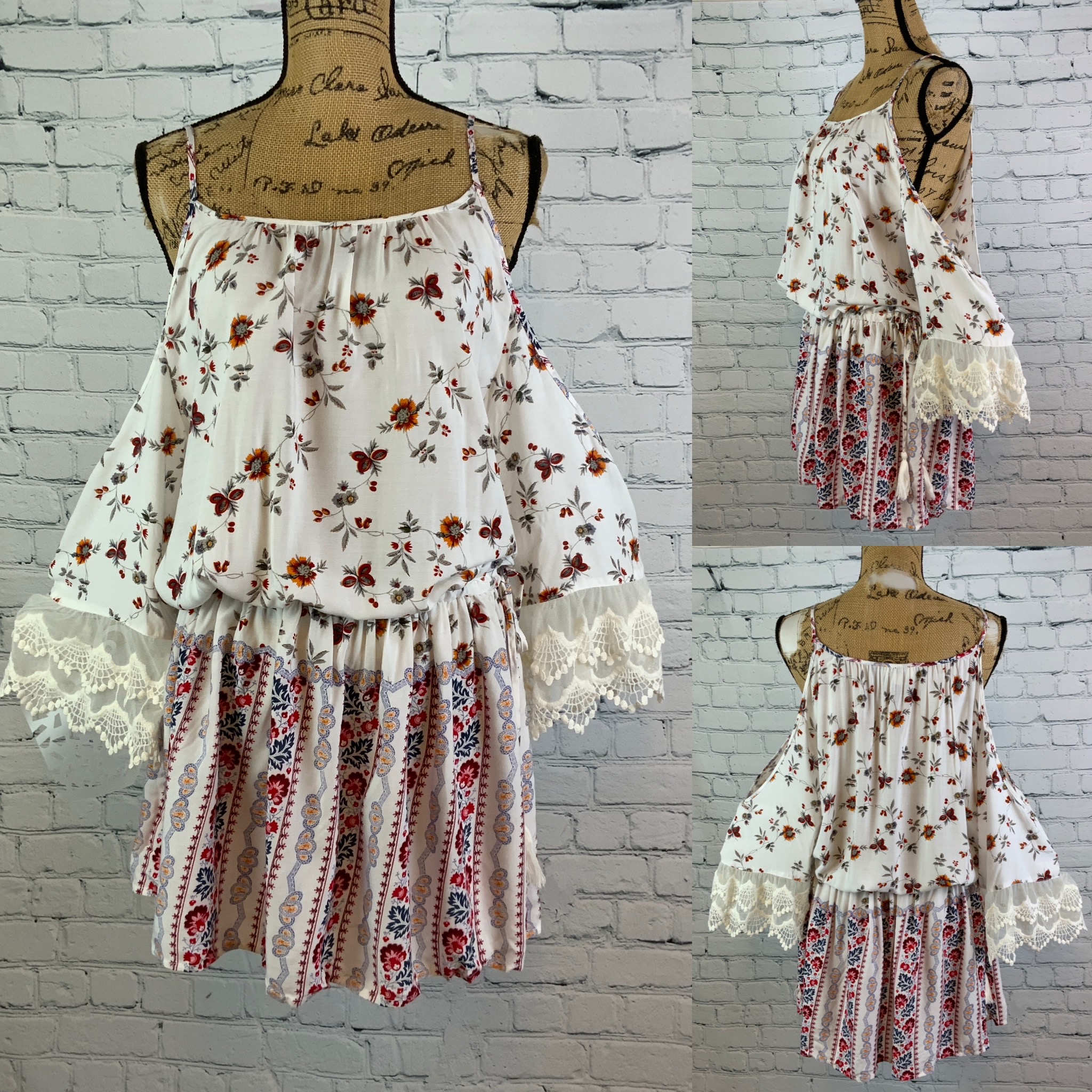 Umgee boho print tunic has cold shoulders with lace trimmed bell sleeves, drawstring waist with tassel ties on both sides.