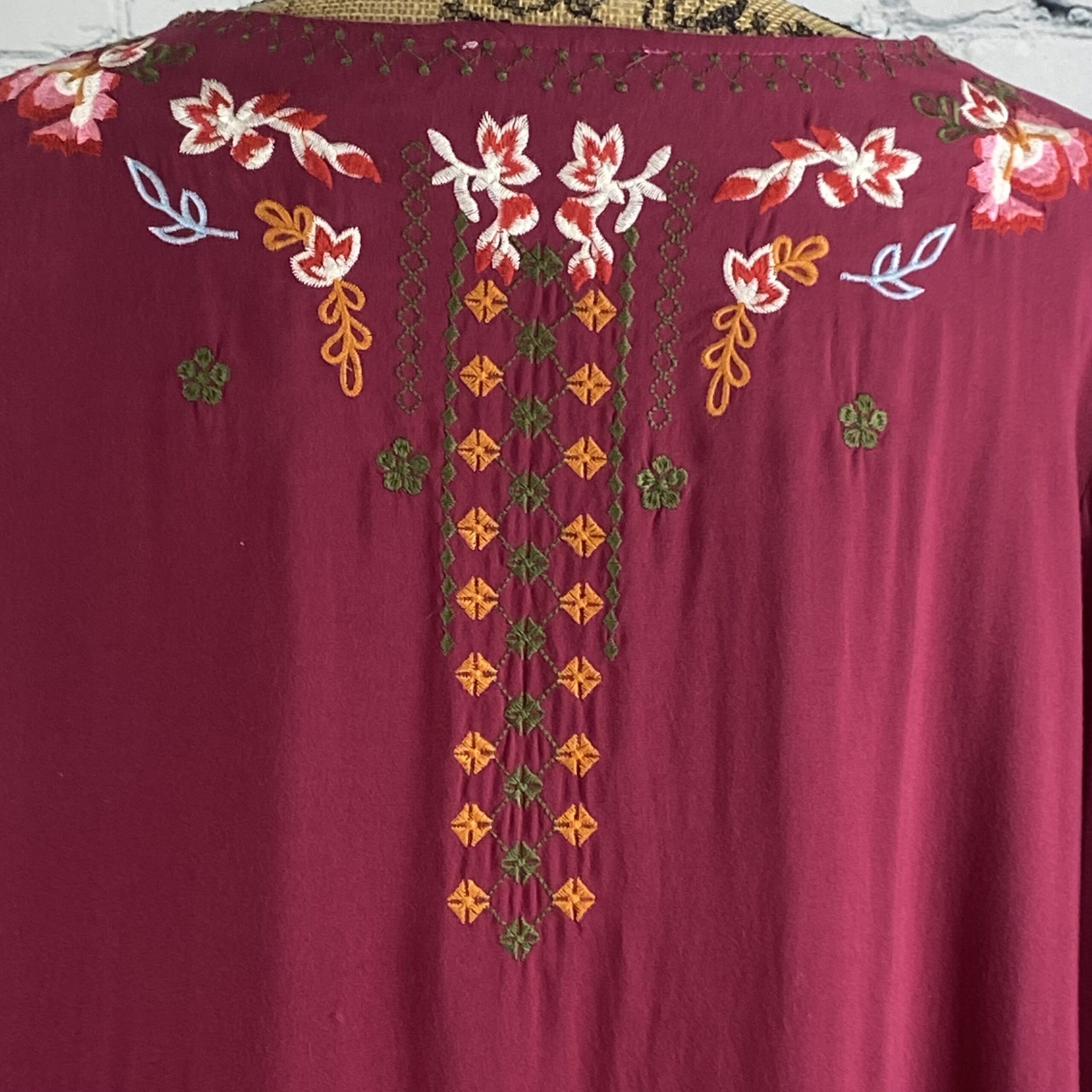 Umgee burgandy dress/tunic has front tassel ties, 3/4 flared sleeves and detailed embroidered all over.