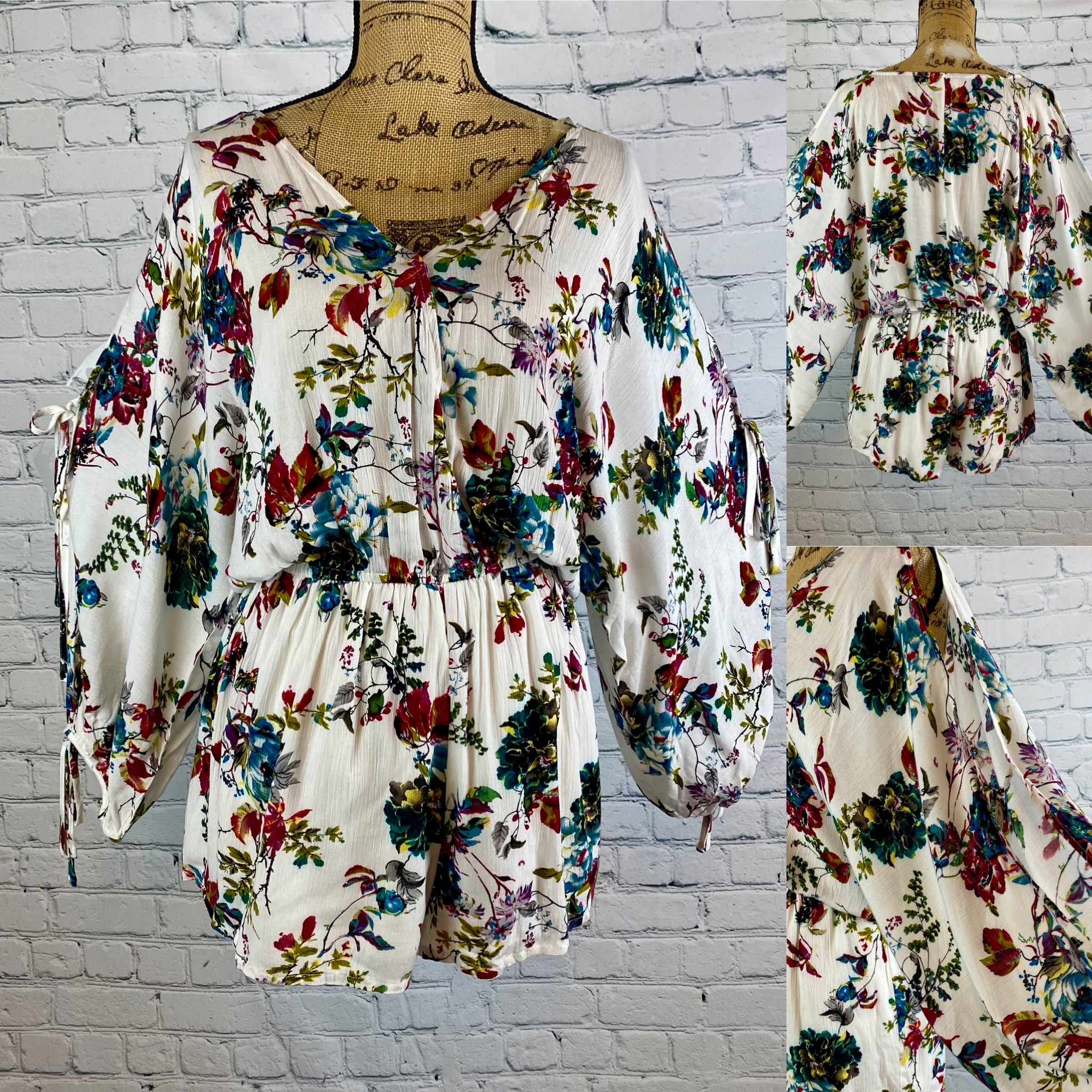 Umgee crinkly floral print romper has a cross front with safety snap, elastic waist & long split dolman sleeves with ties midway & at the cuff. Lined at the bottom.