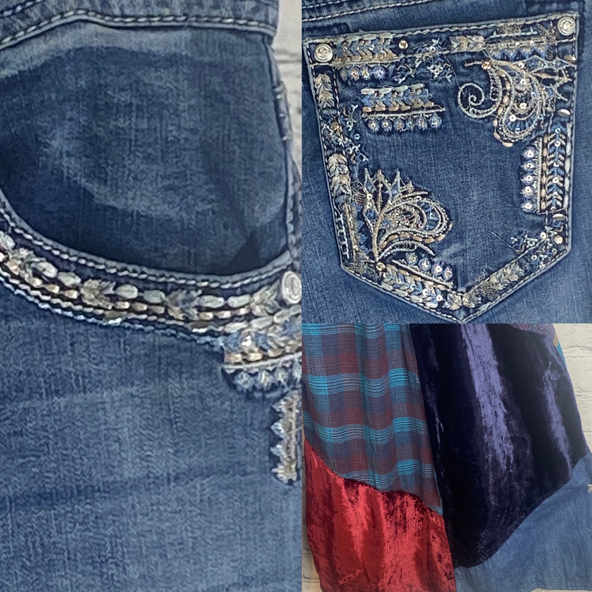Upcycled one of a kind Grace jeans with blue sparkly pocket trim paired with plaid/denim/velvet patchwork bell bottoms. Put together with quality thrifted items.