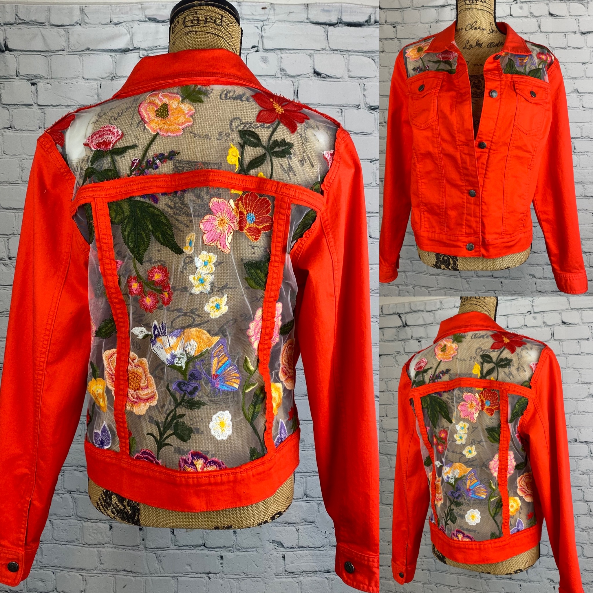 / Upcycled Orange Jean Jacket & Flower Tulle Fabric