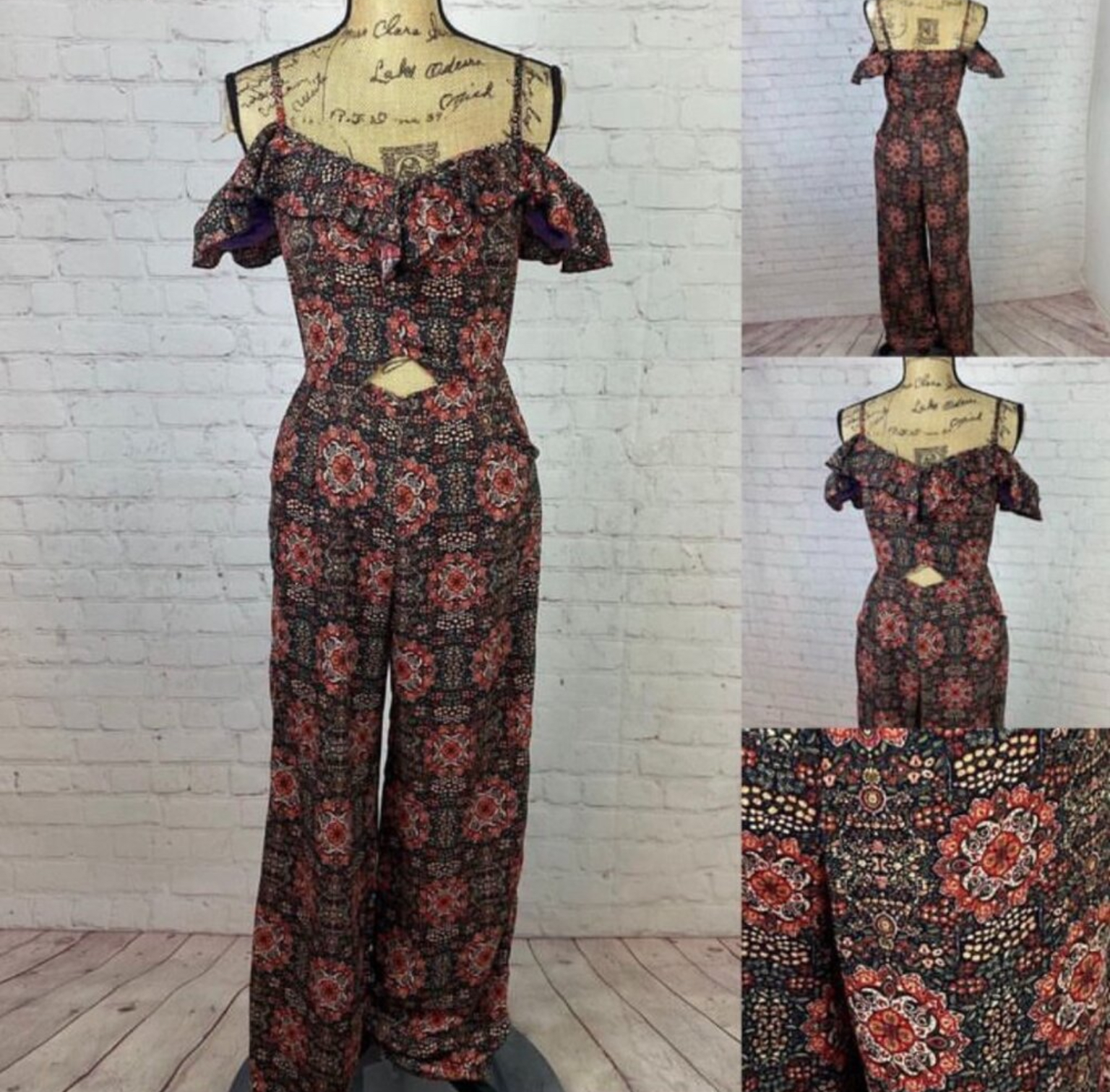 Xhilaration mandala print cold shoulder jumpsuit has adjustable straps, peekaboo front with wide legs & side pockets.